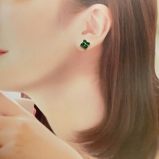 These graceful earrings feature natural green jadeite cabochons set in a delicated four-leaf clover design, symbolizing luck and harmony. Each leaf is formed by a polished round jadeite stone, enhanced by a surrounding halo of shimmering diamond-like stones set in a silver shinny metal, adding sparkle and sophistication.